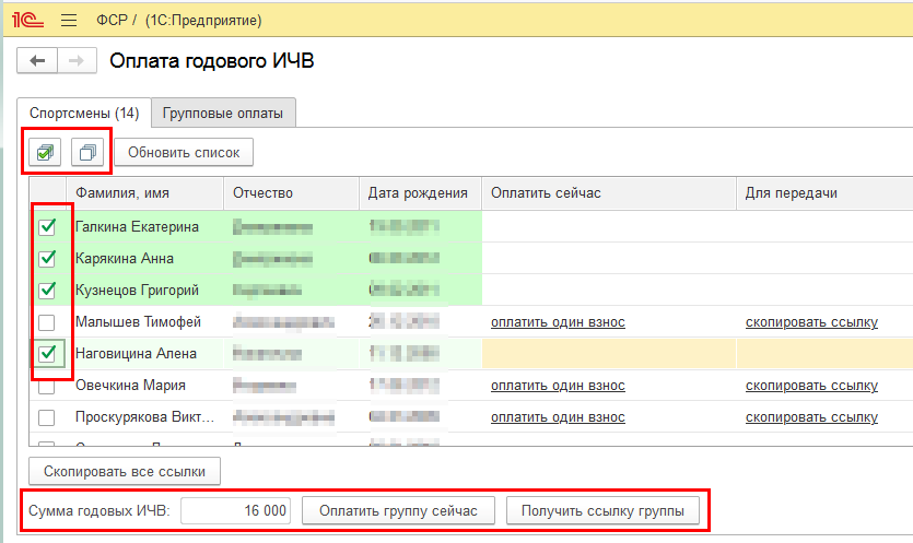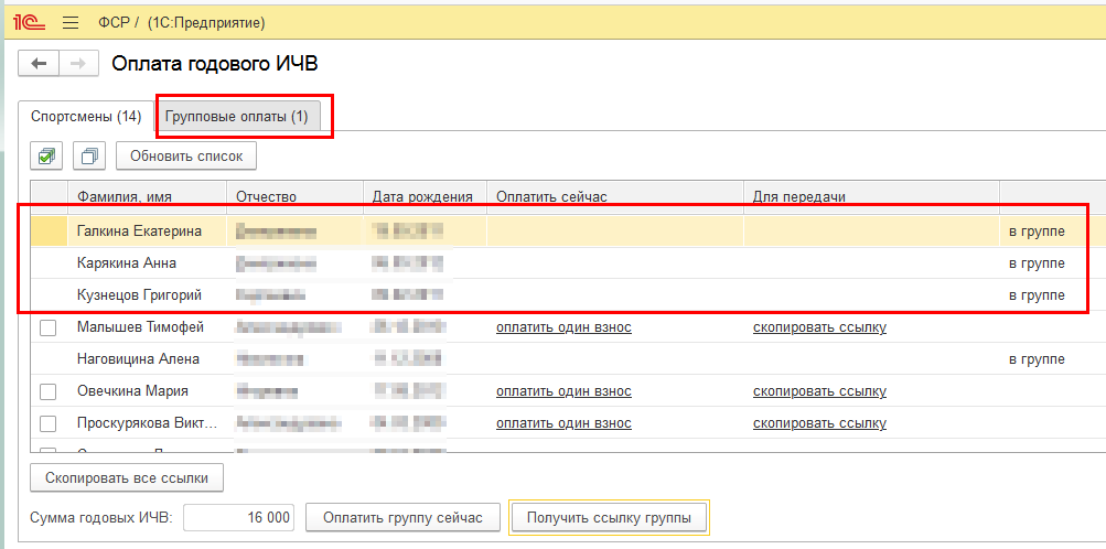После объединения спортсменов в группу в основном списке они становятся недоступны для выбора и оплаты.