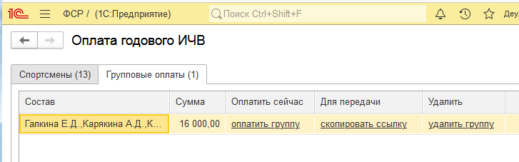 При нажатии на кнопку Получить ссылку группы можно объединить спортсменов в группу и скопировать ссылку на групповой платеж в буфер обмена, например, для отправки ответственному.